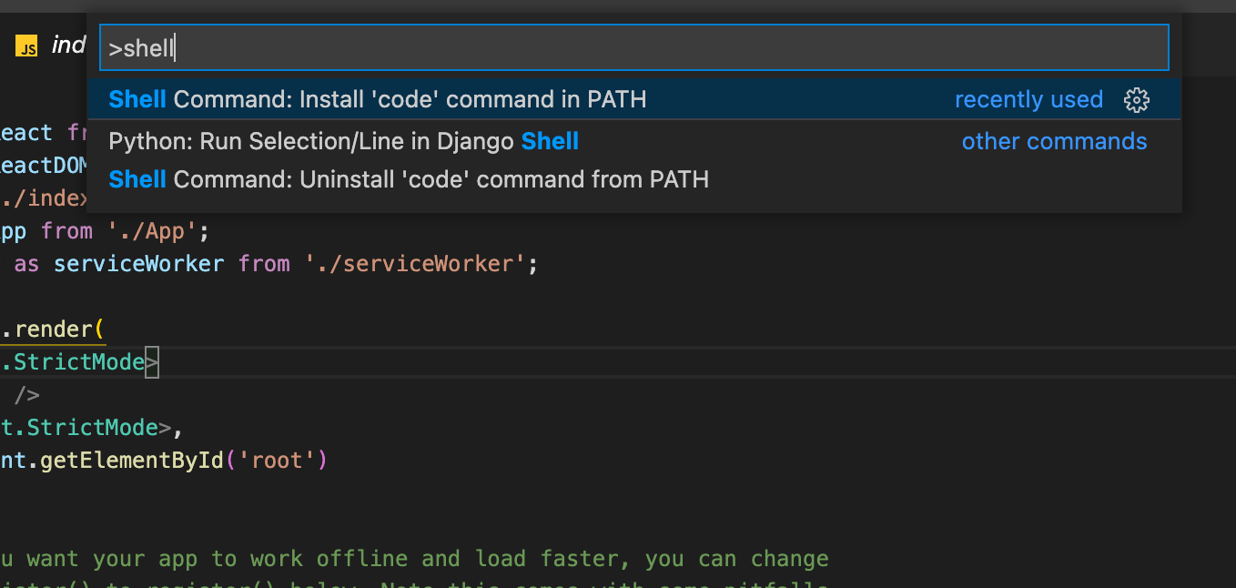 shell command 를 검색해서 code 명령어를 install 해주면 된다. (enter 만 누르면 됨)